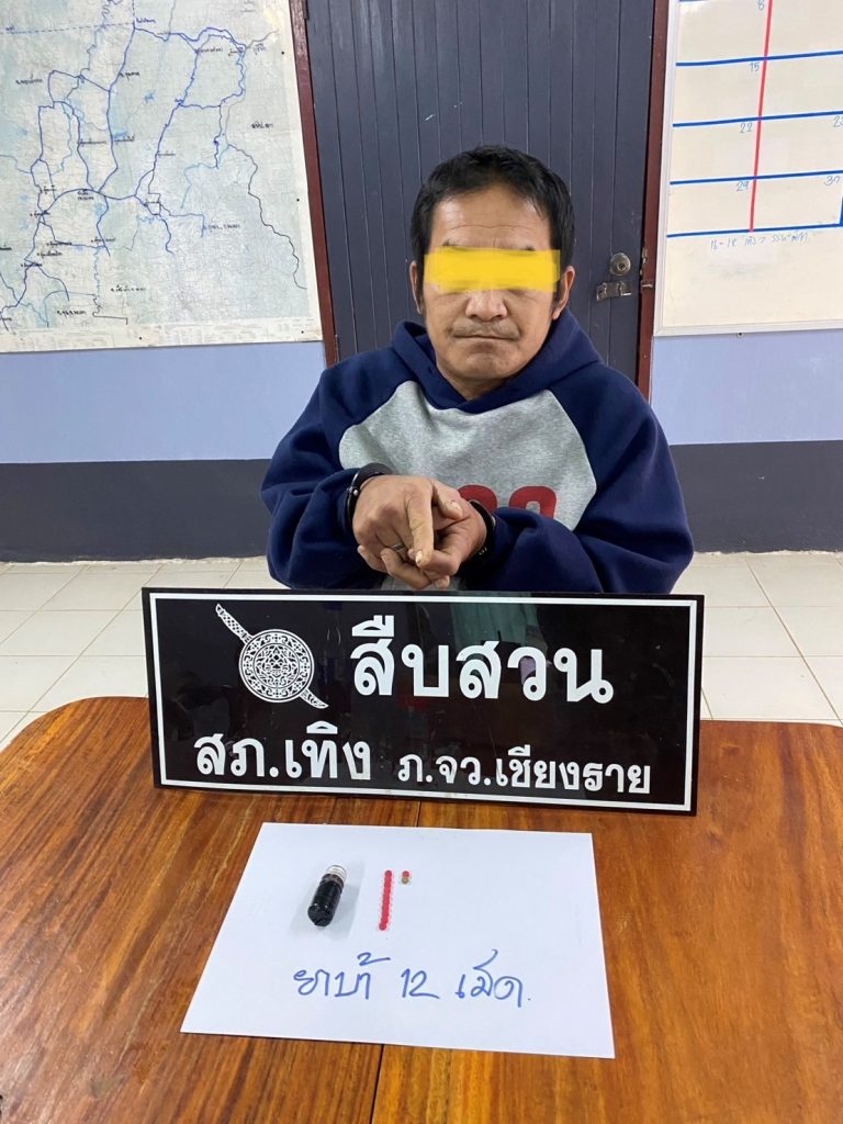 เมื่อวันที่ 16 ธ.ค.2567 ได้มีการจับกุมตัวผู้ต้องหา “ครอบครองยาเสพติดให้โทษประเภท 1 (เมทแอมเฟตามีนหรือยาบ้า) โดยไม่ได้รับอนุญาตฯ” จำนวน 1 ราย 1 คน ได้จับกุมนายนิพัท ประมวล อายุ 41 ปี บ้านเลขที่ 43 ม.3 ต.เวียง อ.เทิง จว.เชียงราย พร้อมด้วยของกลางยาบ้า จำนวน 12 เม็ด เหตุเกิด ถนน ม.3 ต.เวียง อ.เทิง จว.เชียงราย