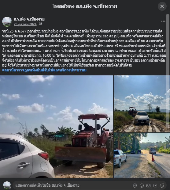 วันนี้(25 ต.ค.67) เวลาประมาณบ่ายโมง สถานีตำรวจภูธรเทิง ได้รับแจ้งขอความช่วยเหลือจากประชาชนว่ารถติดหล