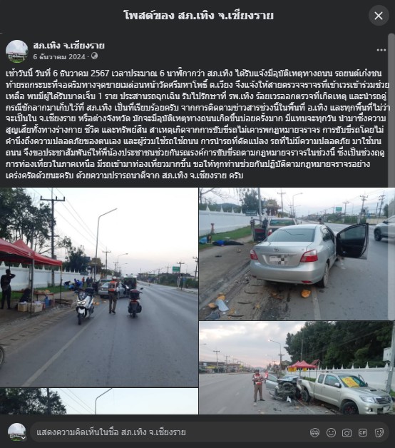 วันที่ 6 ธันวาคม 2567 เวลาประมาณ 06.00น. สภ.เทิง ได้รับแจ้งมีอุบัติเหตุทางถนน รถยนต์เก๋งชนท้ายรถกระบ