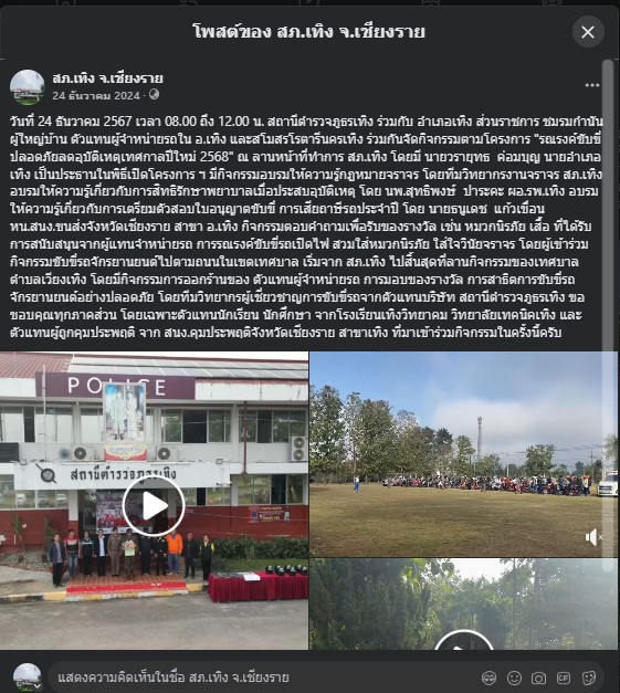 วันที่ 24 ธันวาคม 2567 เวลา 08.00 ถึง 12.00 น. สถานีตำรวจภูธรเทิง ร่วมกับ อำเภอเทิง ส่วนราชการ ชมรมก
