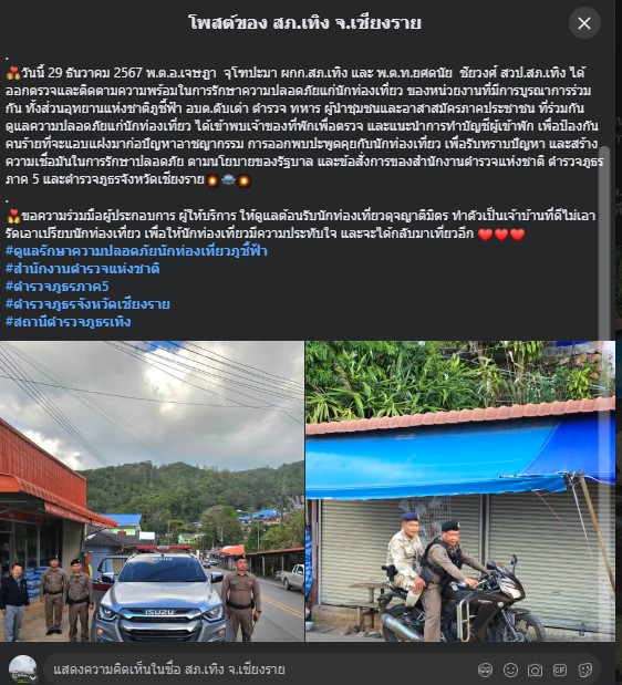 ผกก.สภ.เทิง ออกตรวจความพร้อมการปฏิบัติงานของหน่วยที่รักษาความปลอดภัยนักท่องเที่ยว บนอุทยานแห่งชาติภูชี้ฟ้า(เตรียมการ) เพื่อสร้างความเชื่อมั่น การดูแลความปลอดภัยในชีวิต และทรัพย์สินของประชาชน และนักท่องเที่ยว ในช่วงเทศกาลปีใหม่ 2568