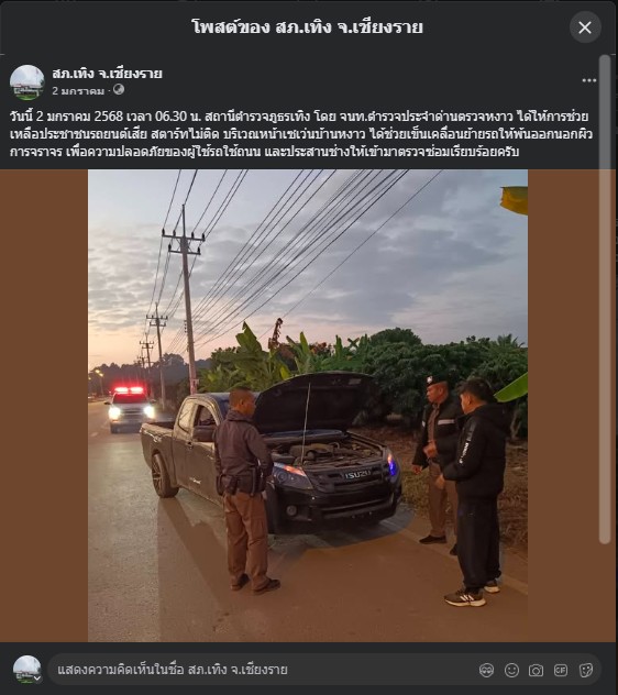 วันนี้ 2 มกราคม 2568 เวลา 06.30 น. สถานีตำรวจภูธรเทิง โดย จนท.ตำรวจประจำด่านตรวจหงาว ได้ให้การช่วยเห