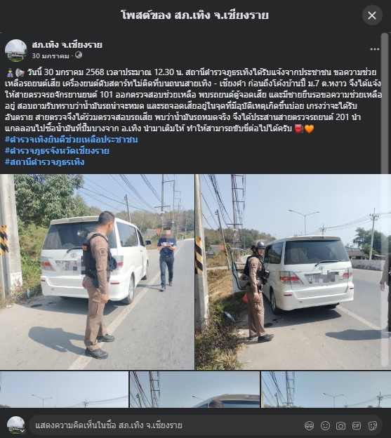 วันที่ 30 มกราคม 2568 เวลาประมาณ 12.30 น. สถานีตำรวจภูธรเทิงได้รับแจ้งจากประชาชน ขอความช่วยเหลือรถยน