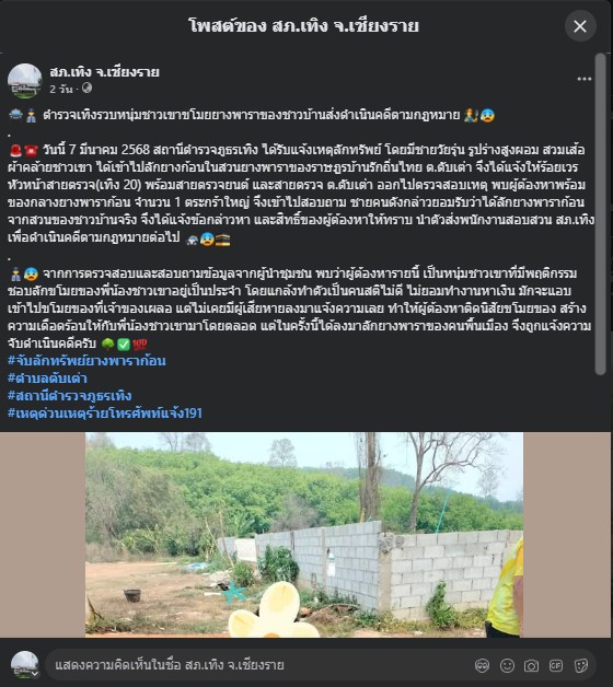 วันที่ 20 มีนาคม 2568 สถานีตำรวจภูธรเทิง ได้รับแจ้งจาก ร.ต.อ.ณัฐพล ศรีคำจักร รองสารวัตรปฏิบัติงานรับ